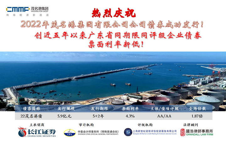 9月15日,2022年茂名港集團(tuán)有限公司公司債券成功發(fā)行,發(fā)行規(guī)模5.9億元,期限為5+2年,票面年利率4.3%,全場(chǎng)認(rèn)購(gòu)倍數(shù)為1.87倍。本期債券創(chuàng)下票面利率新突破:創(chuàng)近五年以來(lái)全國(guó)同期限同評(píng)級(jí)企業(yè)債券第三低、廣東省同期限同評(píng)級(jí)企業(yè)債券票面利率新低! 在兩小時(shí)的簿記中,茂名港集團(tuán)公司債券得到多家金融機(jī)構(gòu)爭(zhēng)先認(rèn)購(gòu),使得本期公司債券利率一路走低,由4.8%降至4.3%,最終簿記當(dāng)天參與投標(biāo)的投資機(jī)構(gòu)超過(guò)20家,投標(biāo)認(rèn)購(gòu)資金高達(dá)11.06億元。其中,14家投資機(jī)構(gòu)中標(biāo),發(fā)行票面利率為4.3%,為集團(tuán)節(jié)省了2095.32萬(wàn)元財(cái)務(wù)成本。