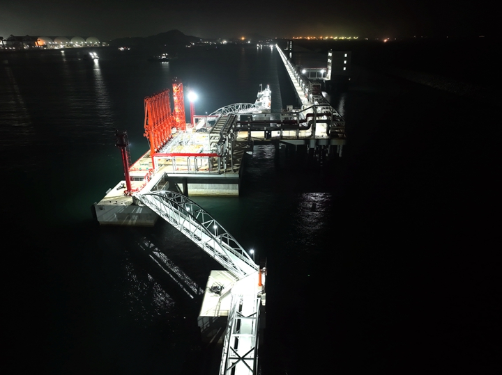 “照明合閘,開(kāi)始照明系統(tǒng)全負(fù)荷24小時(shí)試運(yùn)行測(cè)試”隨著對(duì)講機(jī)里面?zhèn)鞒龅闹噶睿鄄┵R新港區(qū)10萬(wàn)噸級(jí)成品油碼頭項(xiàng)目的213盞防爆投光燈、24盞防爆路燈同時(shí)亮起,從茂名港博賀新港區(qū)的夜空俯視而下,將近5公里的公用管廊如同一條燈帶鑲嵌在港區(qū)東防波堤上,璀璨明亮。而油品碼頭E2泊位,投光燈下橙紅的裝卸臂、大紅的消防炮塔、銀色的撬式裝置、還有各色的工藝給排水管道,無(wú)一不充滿了讓人沉醉的工業(yè)美。