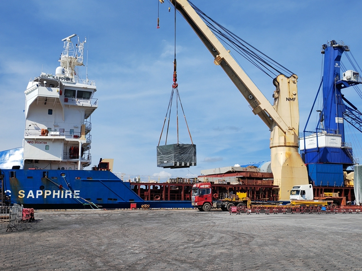 近日,外貿船舶“藍寶石”輪順利靠泊港口經營公司碼頭裝運大型外貿設備,這是港口經營公司今年以來首次靠泊的萬噸級外貿船舶。