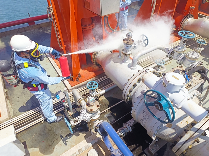 演練現(xiàn)場,警報聲響起,人員、車輛迅速集結(jié)到位。按照搶險救災(zāi)組、疏散警戒組、通訊聯(lián)絡(luò)組、后勤保障組、醫(yī)療救護組、后勤醫(yī)療組等五個工作組的分工要求,參演人員各就各位、各司其責。他們有的迅速疏散無關(guān)人員完成現(xiàn)場警戒;有的迅速向市公司指揮中心及相關(guān)部門報告情況;有的迅速使用消防水泵泡沫泵、干粉滅火器撲滅初期火災(zāi),并對泊位E2裝卸區(qū)進行全面冷卻;有的迅速開展醫(yī)療及后勤等方面的應(yīng)急處理。各參演小組反應(yīng)快速、緊密配合、協(xié)同作戰(zhàn),現(xiàn)場警戒、人員疏散、滅火救援、后勤保障等各項應(yīng)急動作有序進行,處理流程和處理措施合理有效。