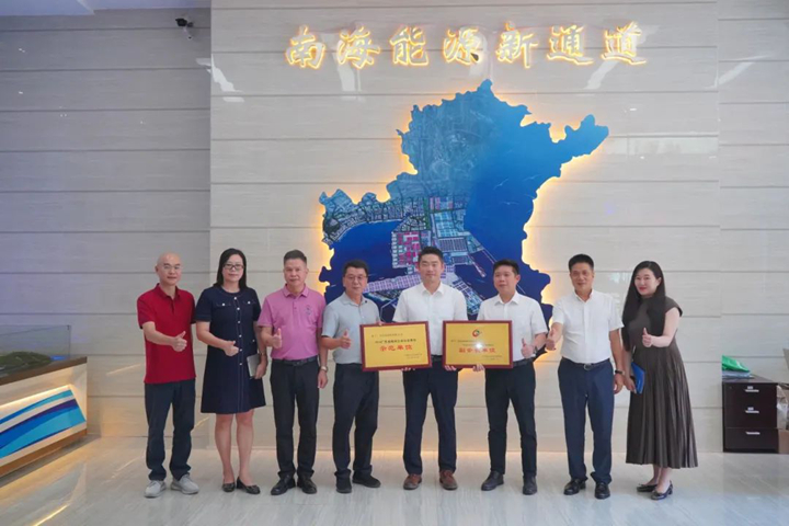 蔣斌一行首先察看博賀新港區(qū)規(guī)劃沙盤及企業(yè)文化墻并舉行了授牌儀式。他代表廣東省企業(yè)文化研究會(huì)向集團(tuán)授予了“副會(huì)長(zhǎng)單位”及“2024廣東省推動(dòng)企業(yè)社會(huì)責(zé)任示范單位”榮譽(yù)稱號(hào),朱廣宇代表茂名港集團(tuán)接受兩項(xiàng)榮譽(yù)牌匾。
