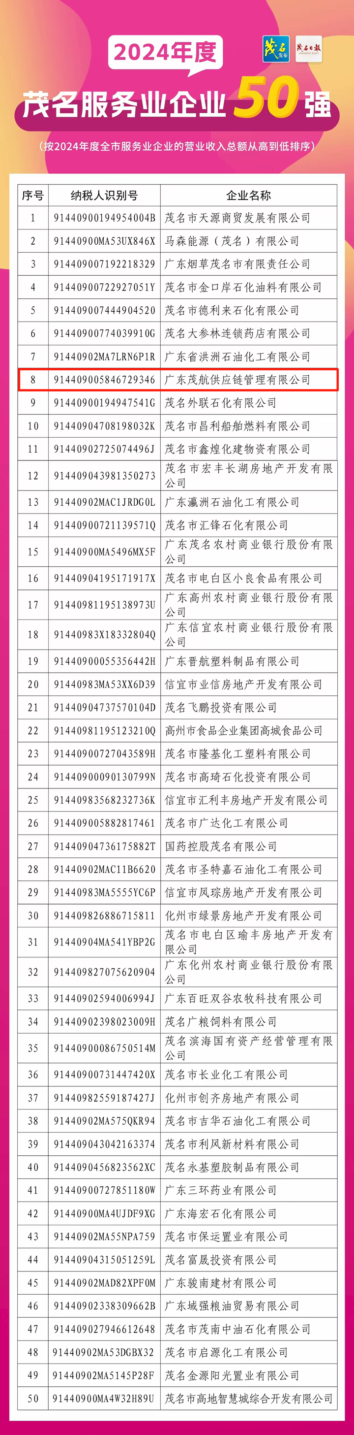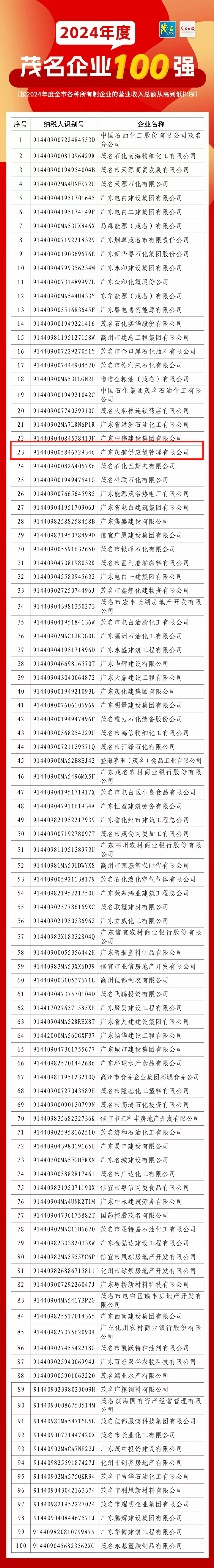 根據(jù)茂名市企業(yè)聯(lián)合會于2025年7月15日發(fā)布的通報,集團下屬茂航供應(yīng)鏈公司以優(yōu)異的業(yè)績表現(xiàn)位列茂名企業(yè)100強第23位,較2023年第37位躍升14名,并首次躋身茂名服務(wù)業(yè)企業(yè)50強第8位。此次雙榜單的歷史性突破,標(biāo)志著茂航供應(yīng)鏈公司從傳統(tǒng)供應(yīng)鏈貿(mào)易商向供應(yīng)鏈科技企業(yè)的轉(zhuǎn)型取得實質(zhì)性成果。