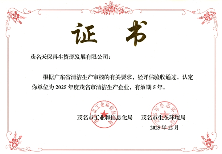 近日,茂名天保再生資源發(fā)展有限公司(以下簡稱“天保公司”)正式確定為茂名市2025年度清潔生產企業(yè),該認定有效期為5年。