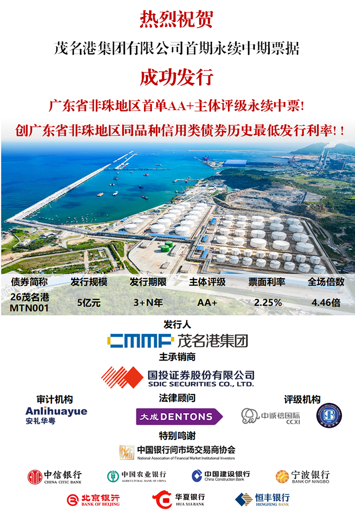 2月4日,正值立春,萬物始新。茂名港集團(tuán)在這一天成功簿記發(fā)行5億元永續(xù)中期票據(jù),以生機(jī)盎然之勢(shì)為集團(tuán)發(fā)展注入新的蓬勃?jiǎng)恿。本次債券期限?+N年,發(fā)行成果尤為亮眼——票面利率2.25%,全場(chǎng)認(rèn)購(gòu)倍數(shù)高達(dá)4.46倍,票面利率為茂名地區(qū)全品種債券發(fā)行最低紀(jì)錄,亦創(chuàng)下廣東省非珠地區(qū)同品種信用類債券歷史新低。