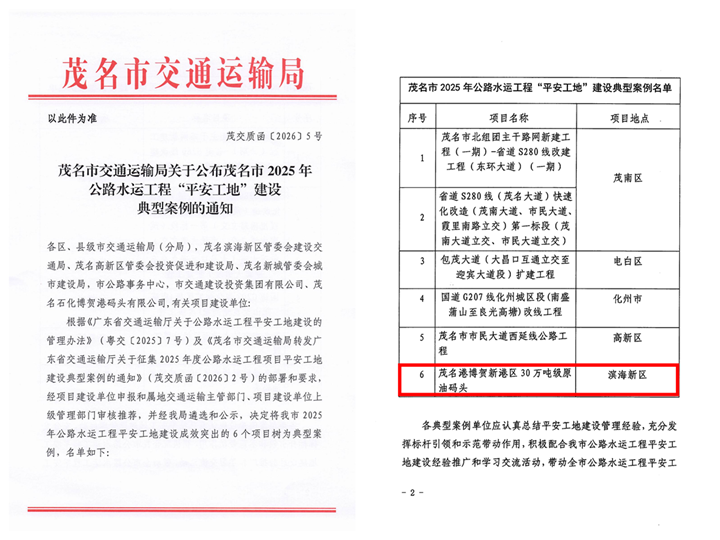 近日,茂名市交通運輸局公布2025年全市公路水運工程“平安工地”建設(shè)典型項目表彰名單,茂名港博賀新港區(qū)30萬噸級原油碼頭項目(以下簡稱“項目”)榮列其中。自2023年以來,項目已連續(xù)三年榮獲此項稱號,以三年如一日的深耕與篤行,筑牢水運工程安全防線,以標桿之姿詮釋“平安筑港”的責任擔當,成為茂名市公路水運工程安全管理領(lǐng)域的示范樣板。